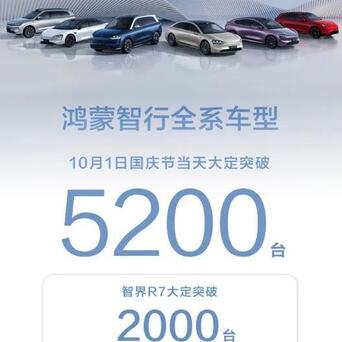 鸿蒙智行在国庆的第1天大定超过5000台,其中新推出的华为和奇瑞联合打造的首款轿跑SUV智己R7大定就是突破2000台,其中问界M9作为一款50万辆车型,当天就是突破1500台。